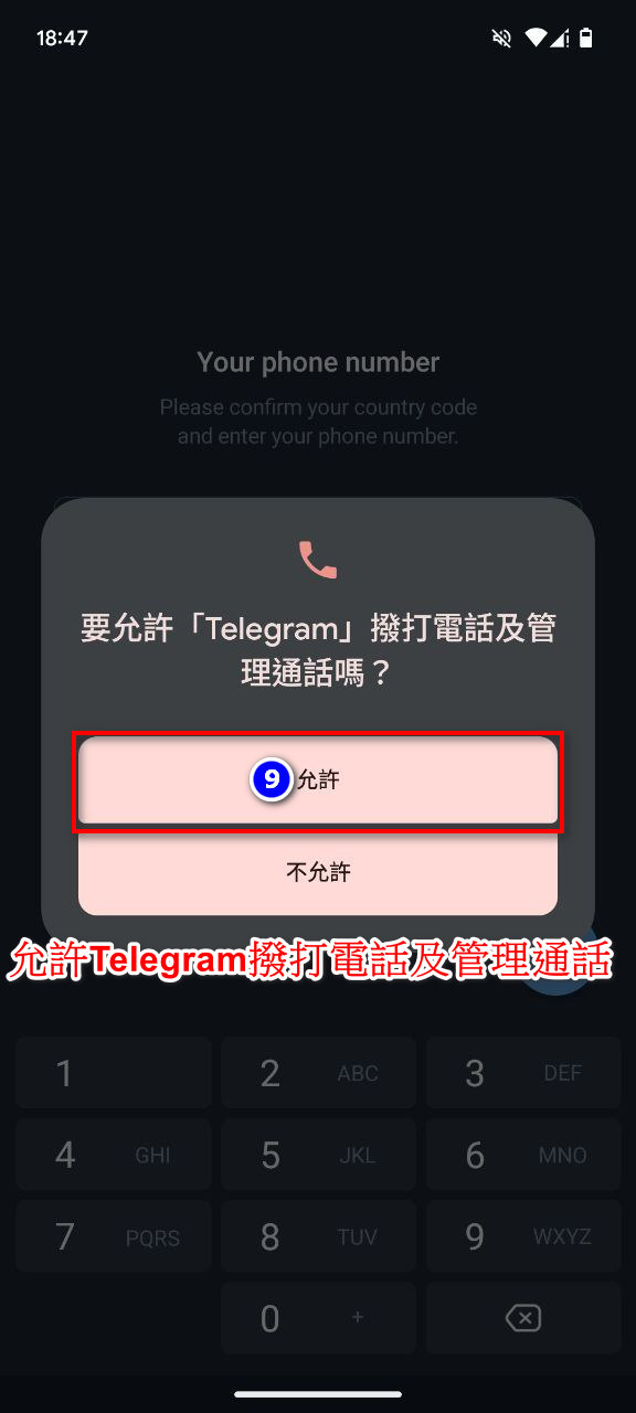 9.按下「允許」按鈕,允許Telegram撥打電話及管理通話。