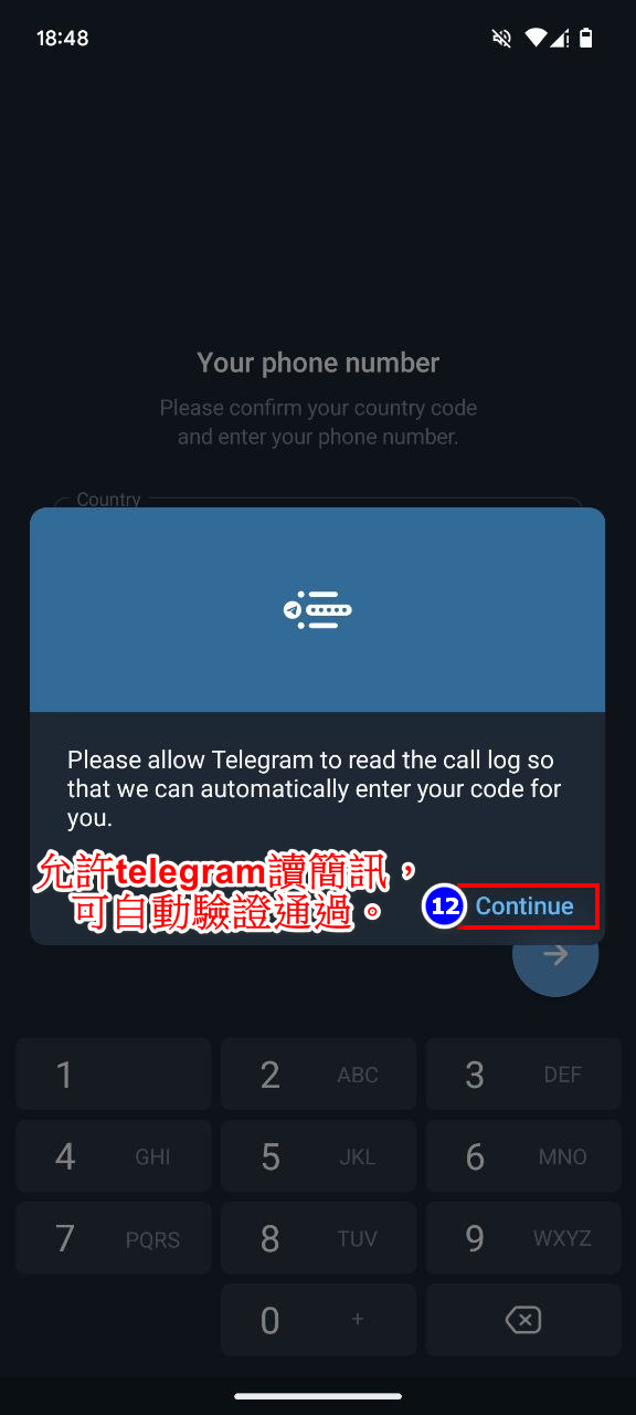 12.允許telegram讀簡訊,可自動驗證通過,按下「Continue」。