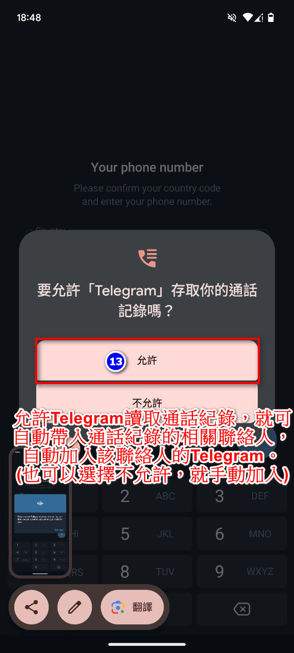 13.允許Telegram讀取通話紀錄,就可自動帶入通話紀錄的相關聯絡人,自動加入該聯絡人的Telegram。(也可以選擇不允許,就手動加入)。