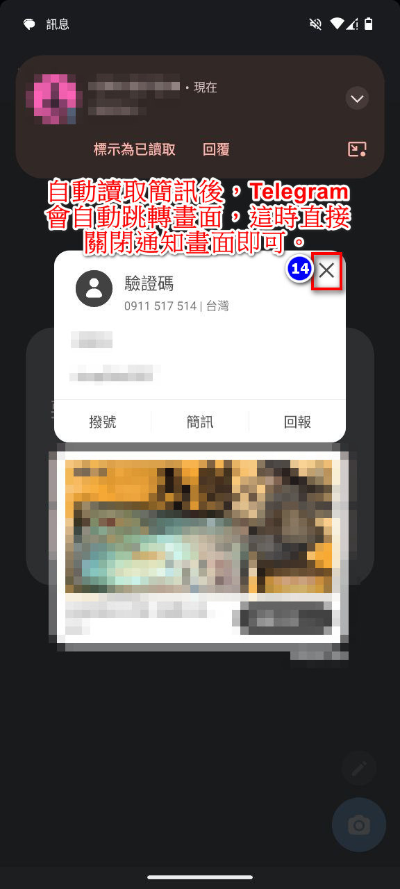14.自動讀許簡訊後,Telegram會自動跳轉畫面,這時直接關密通知畫面即可。