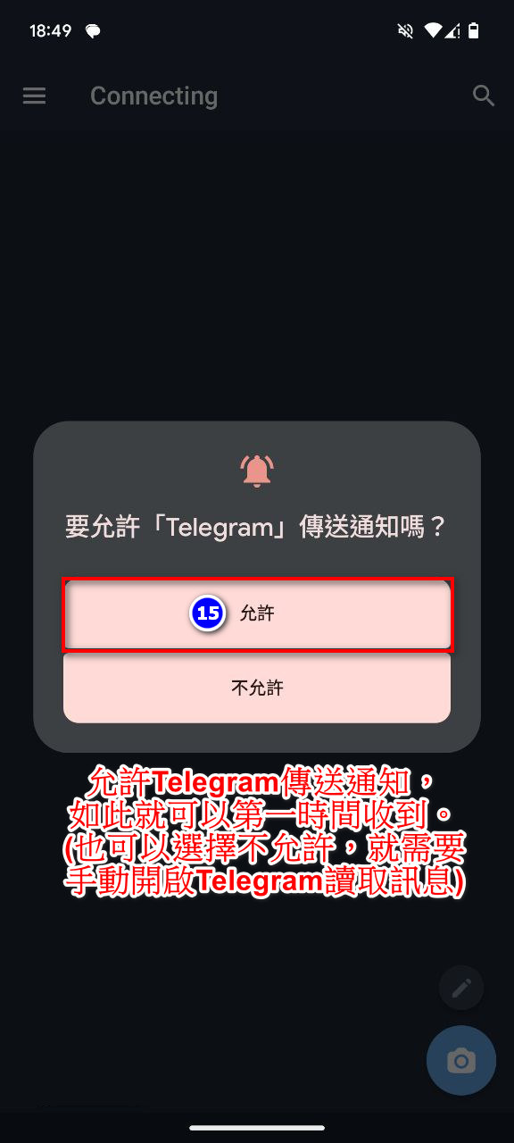15.允許Telegram傳送通知,如此就可以第一時間收到。(也可以選擇不允許,就需要手動開啟Telegram讀取訊息)。