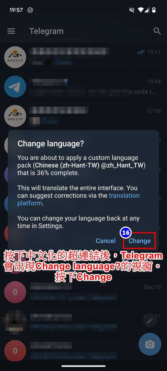 16.若需要Telegram中文化,點 「https://t.me/setlanguage/taiwan 」這個超連結。按下中文化的超連結後,Telegram會出現Change language?視窗,按下Change。
